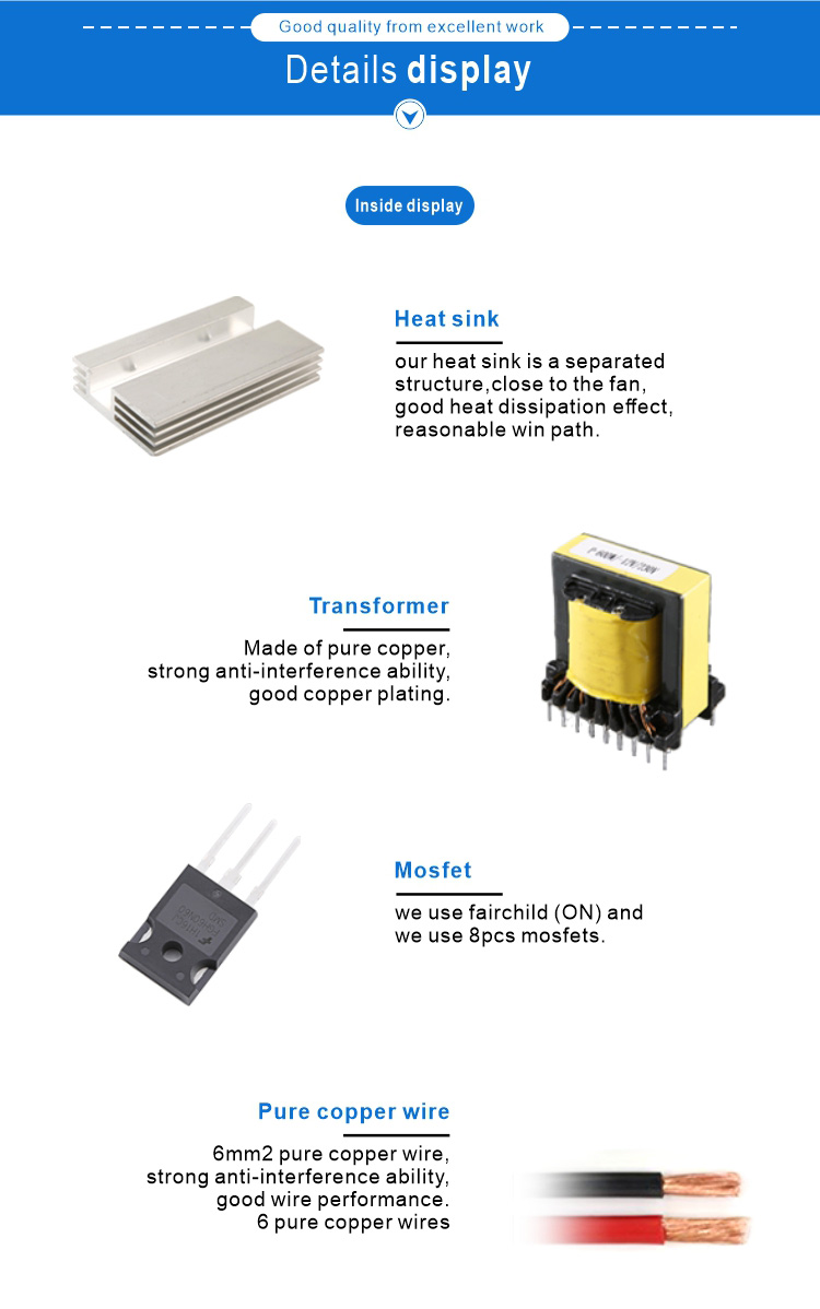 | Protection function | Low voltage | Alarm at first, voltage continously reduce. LED Red light on & shut sown. | ||