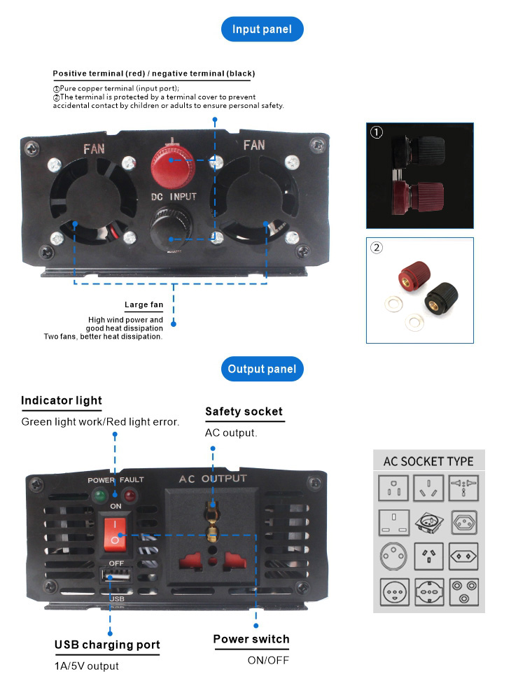 | Output voltage | 100VAC or 110VAC or 120VAC±5% | 220VAC or 230VAC or 240VAC±5% | ||