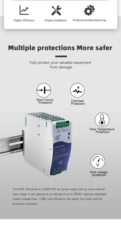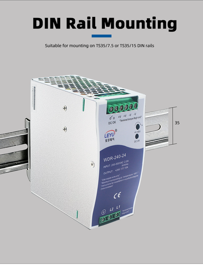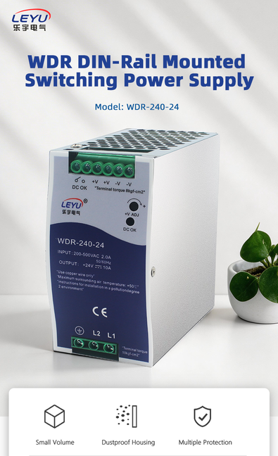 WDR-240W DIN rail power supply delivers 240W with -30℃~+70℃ wide temp range. Available in 24V, 48V, or custom output. Ideal for industrial automation & telecom. 2-year warranty. Get quote today!