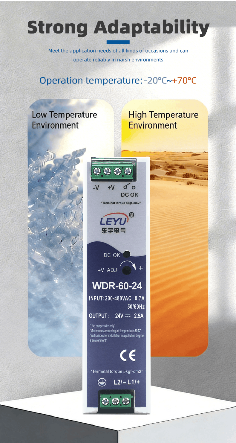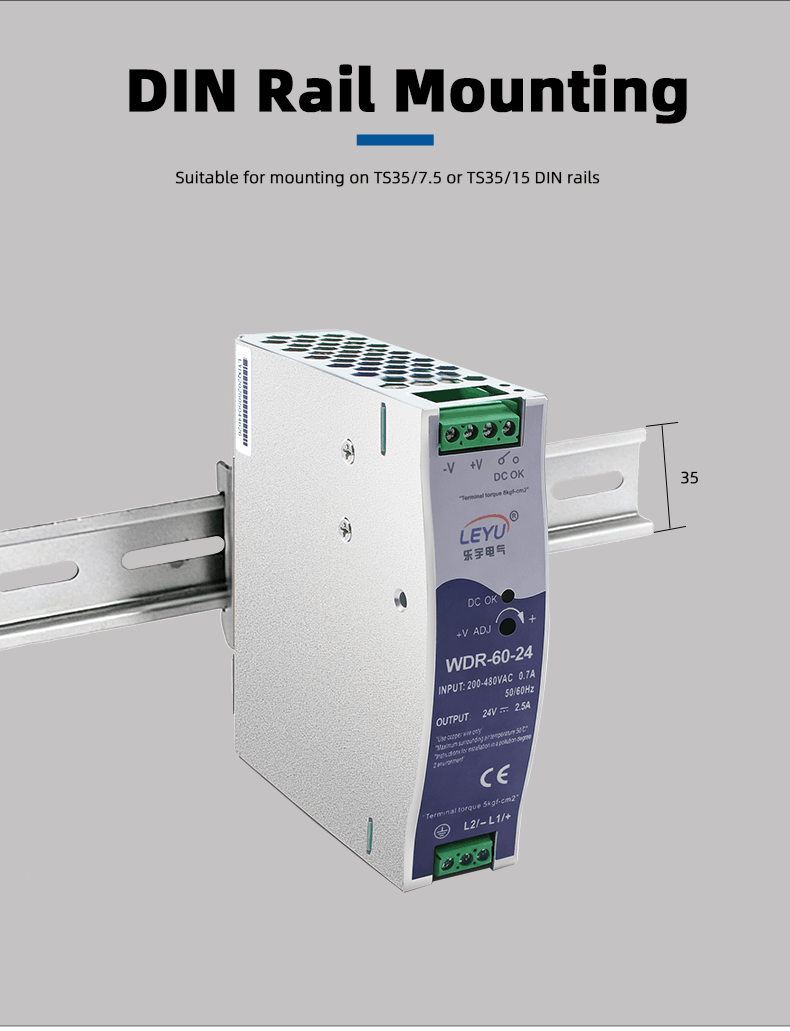 The WDR series offers a high-performance AC/DC power supply solution, ideal for household appliances, factory automation, transportation systems, and building control applications. With a universal input voltage range, it works seamlessly across different regions worldwide. Built-in advanced protection and safety mechanisms ensure reliable operation and long-term stability.