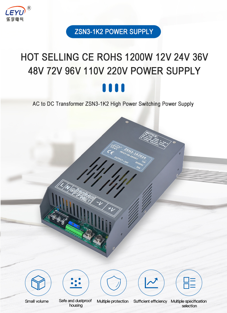 The ZSN3-1K2 is a 1.2KW single-output chassis-type AC-to-DC/DC-to-DC power supply. The entire series has an input voltage range of 180 - 264VAC / 250 - 370VDC and can provide DC output that meets most industrial requirements. Each model can be cooled by an internal variable-speed fan and can operate at temperatures up to 60°C. It has multiple built-in features, such as adjustable output voltage and current, remote on/off control, and auxiliary power, offering various design flexibilities.