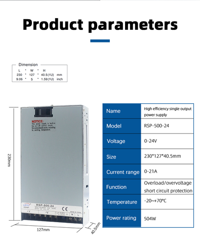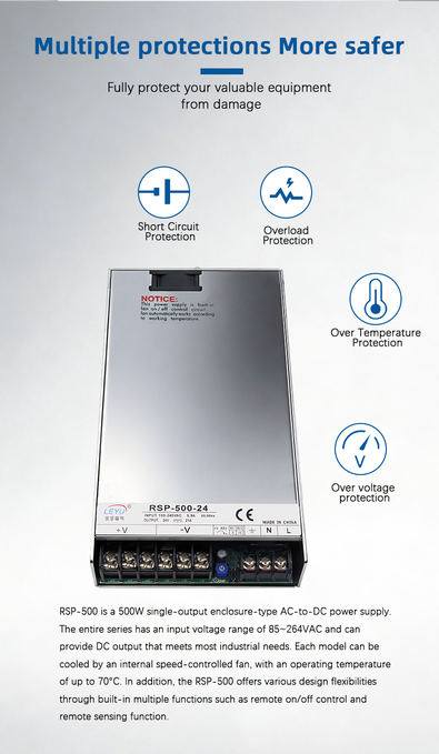 The RSP-500 series consists of single-output, enclosed switching power supplies. These products feature built-in active power factor correction (PFC) and are designed in a low-profile 1U form factor (only 40.5 mm high), making them ideal for space-constrained industrial applications.