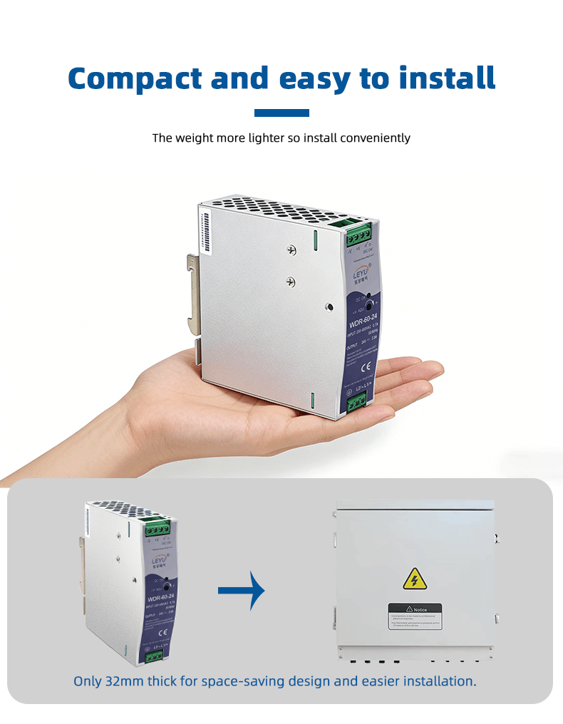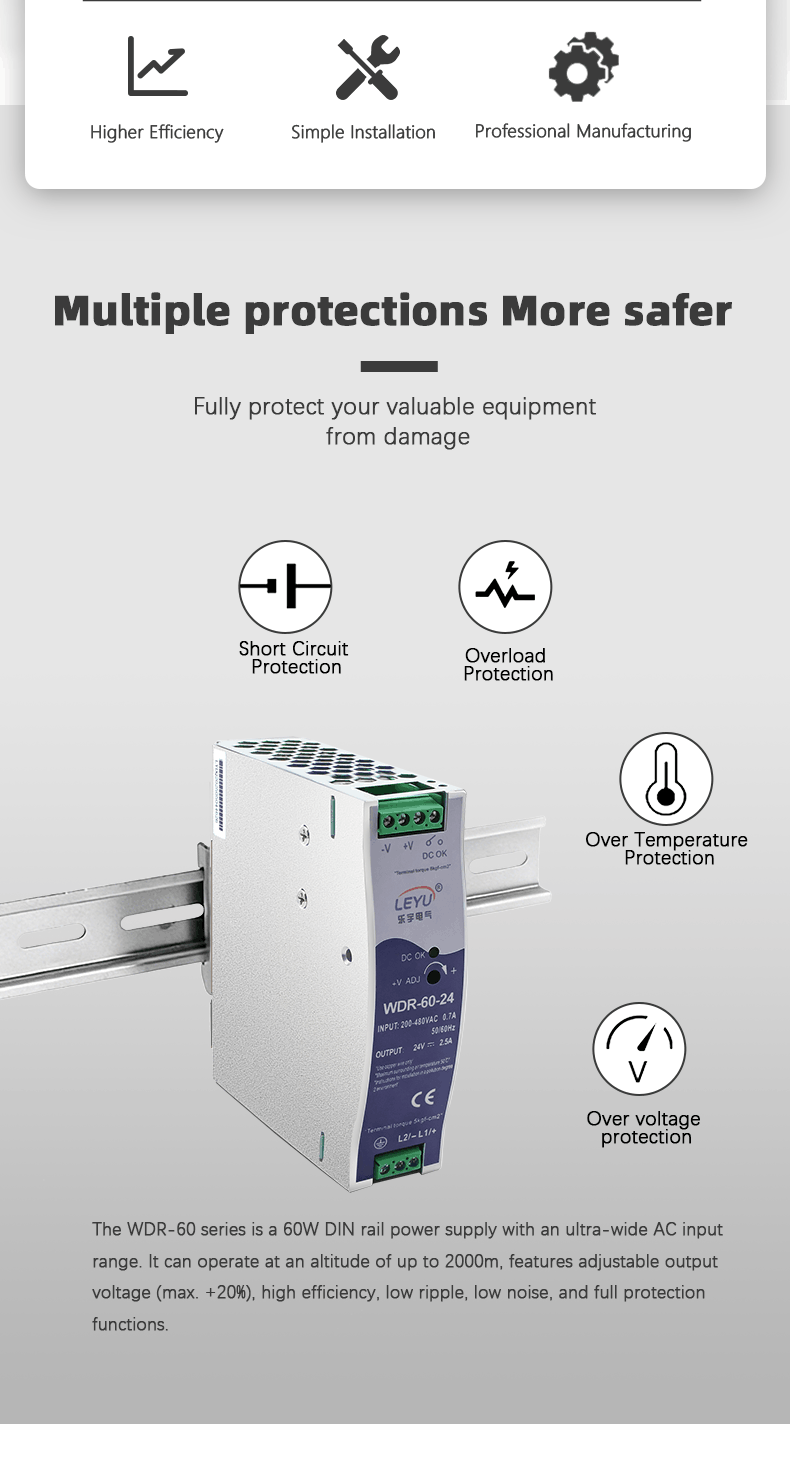The WDR series offers a high-performance AC/DC power supply solution, ideal for household appliances, factory automation, transportation systems, and building control applications. With a universal input voltage range, it works seamlessly across different regions worldwide. Built-in advanced protection and safety mechanisms ensure reliable operation and long-term stability.